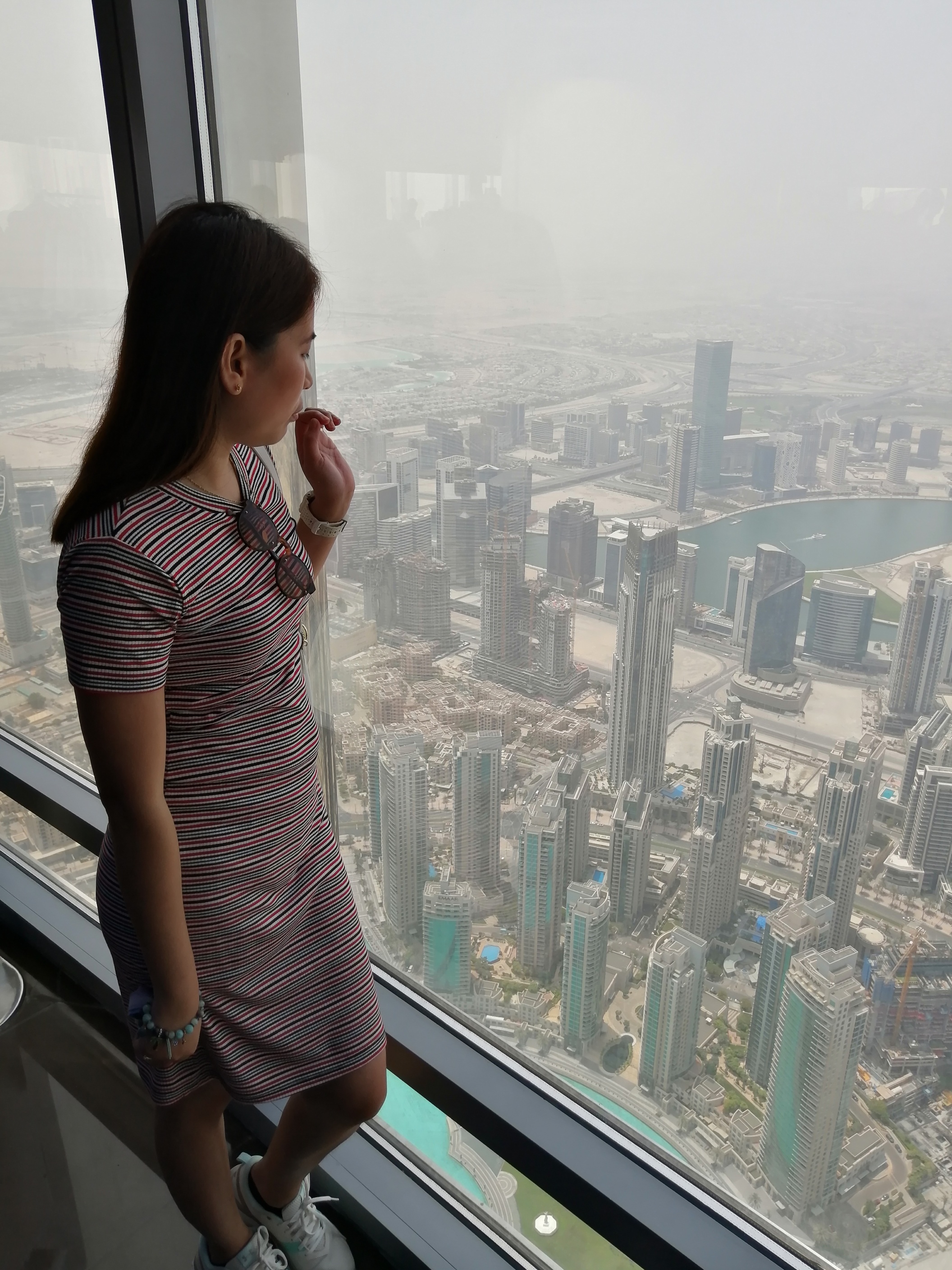 The deck is enclosed by glass walls from floor to ceiling. From the deck, you have a 360-degree sweeping view of Dubai city, desert, and the Gulf.